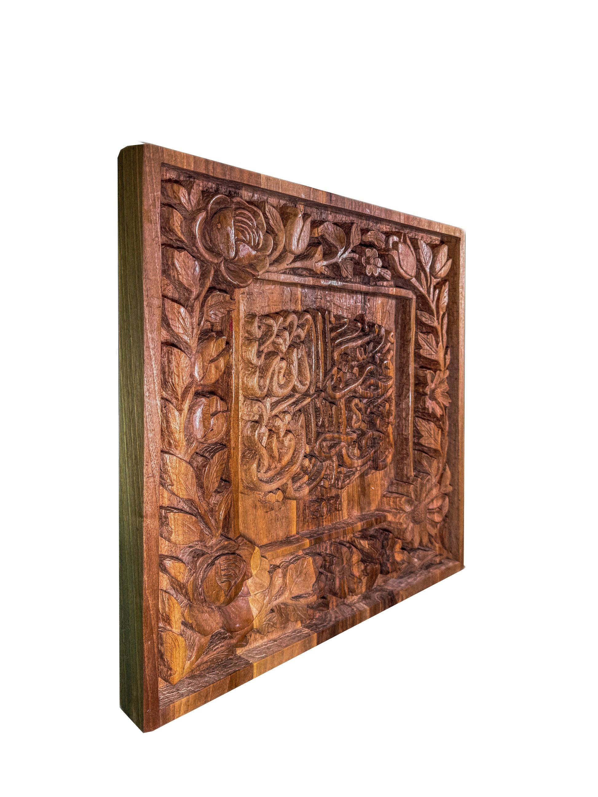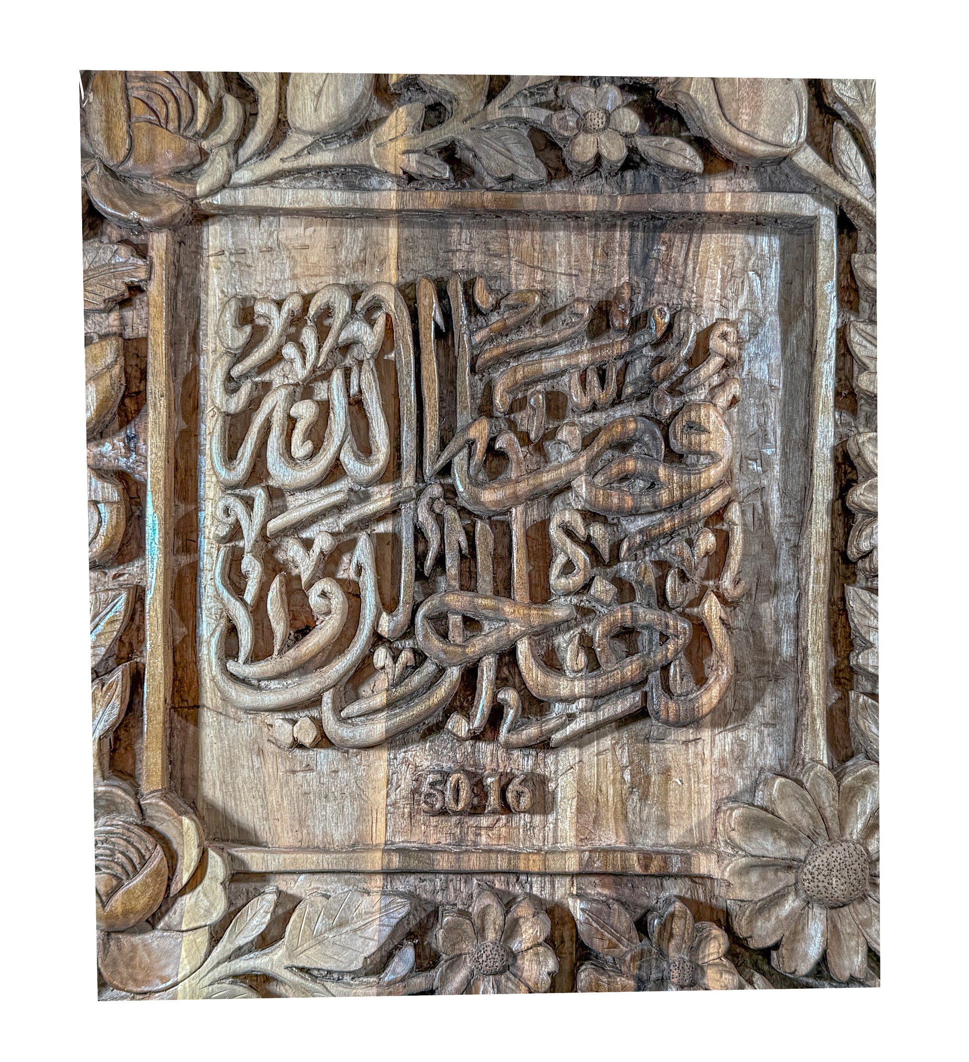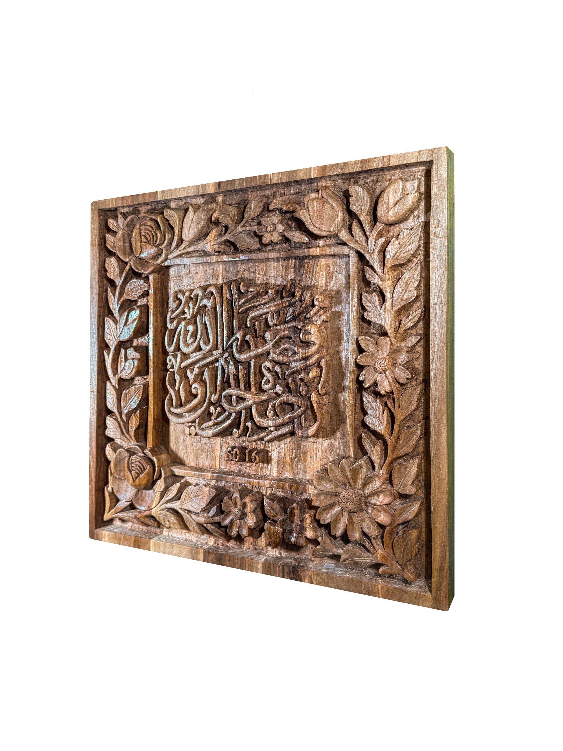 Without using any machinery, this piece was entirely handcrafted over approximately four weeks on walnut wood. It comes to life with verse 16 from Surah Al-Qaf: