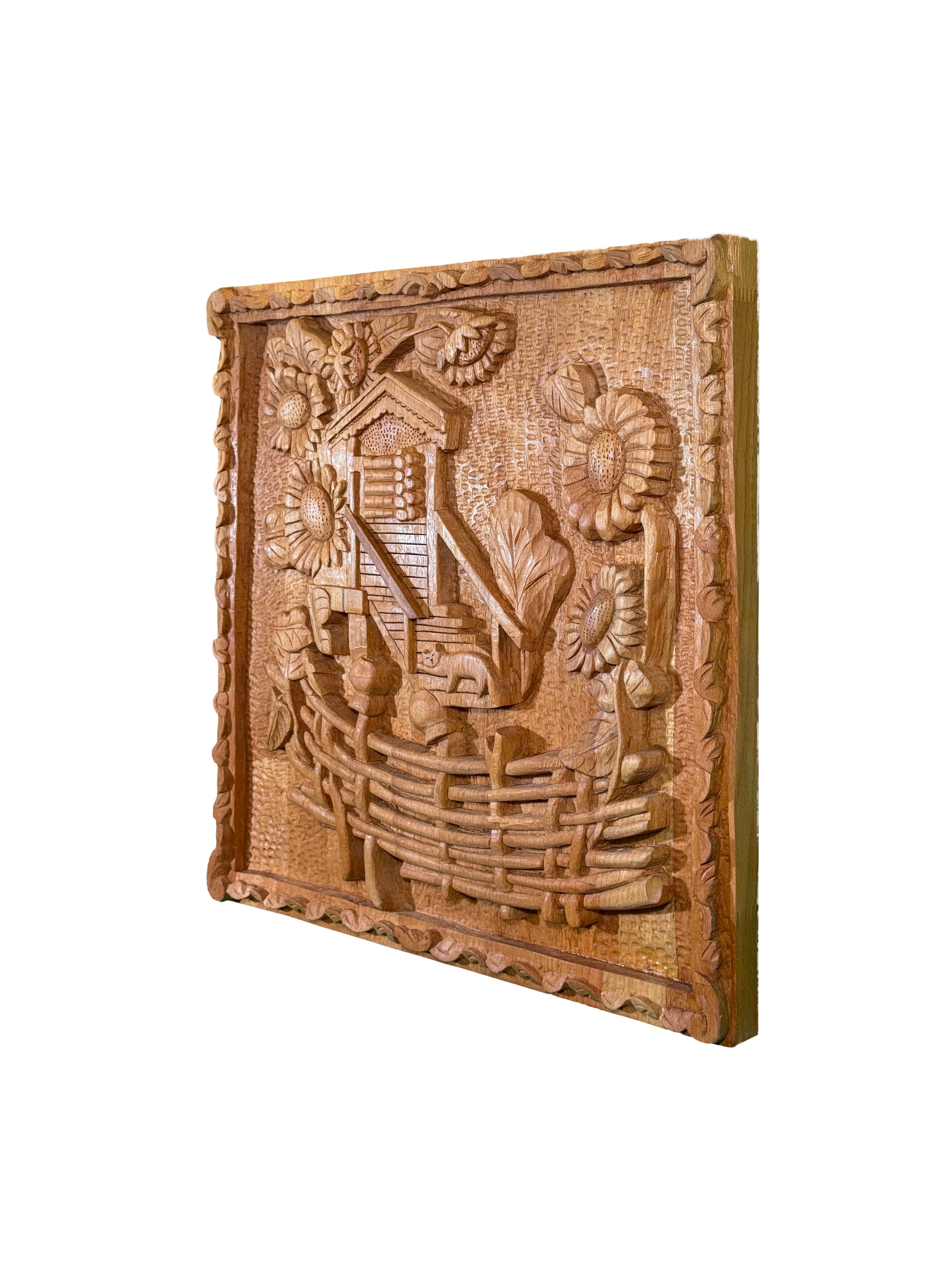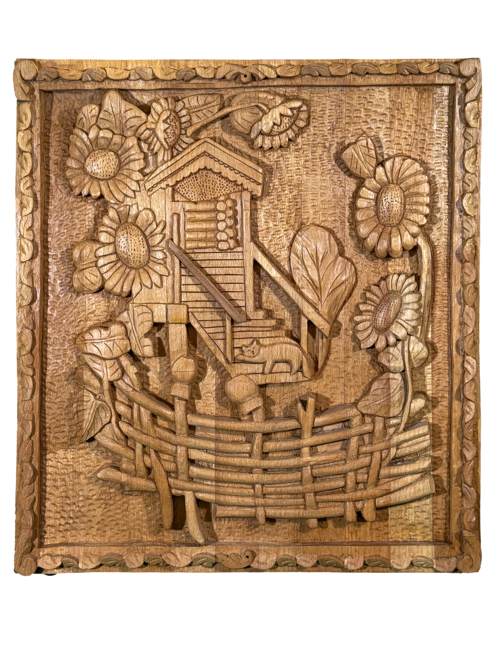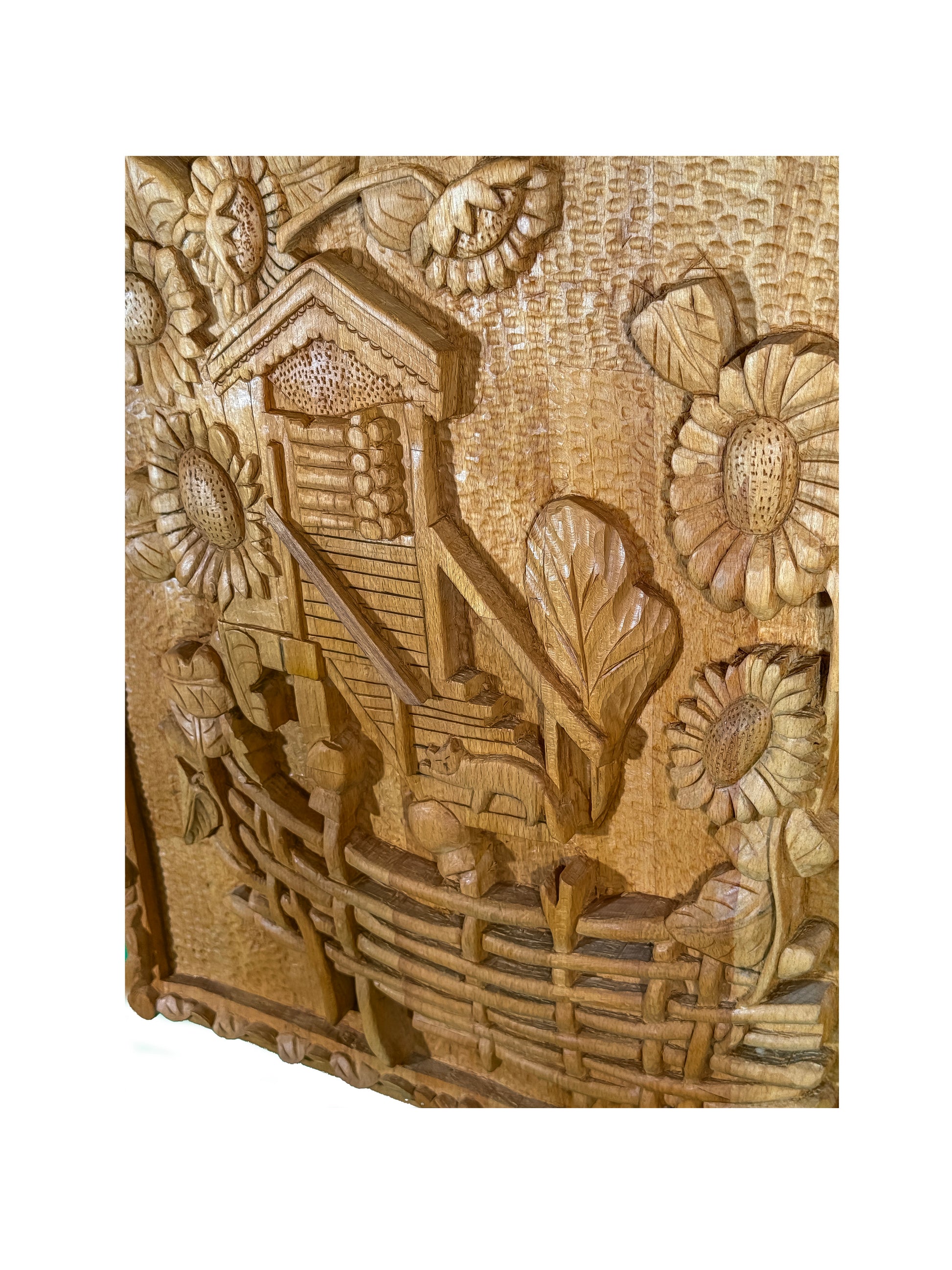 Rising from the warm texture of beech wood, an old village house whispers serenity, surrounded by sunflowers. Each sunflower is meticulously handcrafted with careful attention to detail. No varnish or lacquer has been applied; the piece is treated with teak oil.