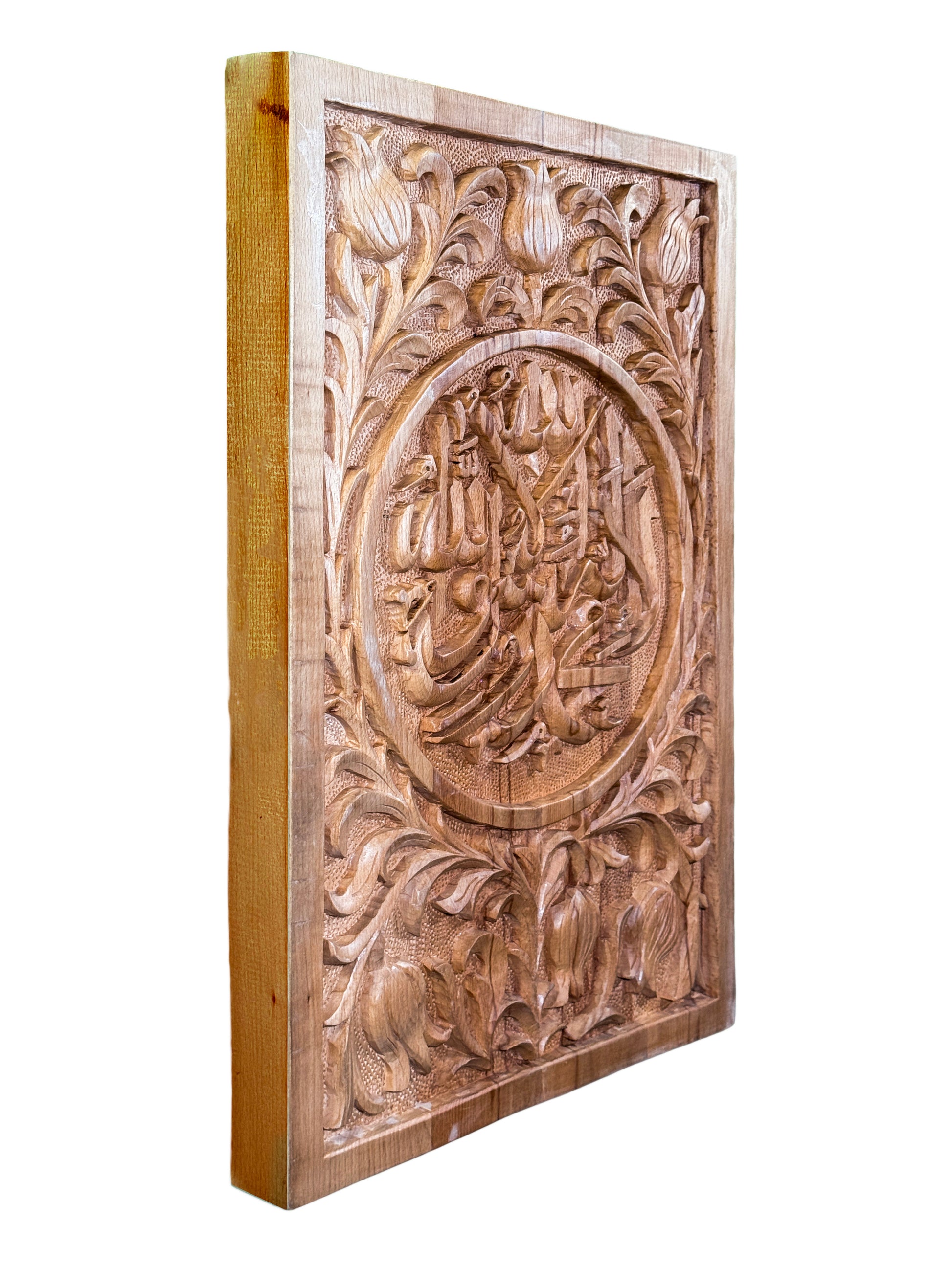 Each pattern of this masterpiece is patiently crafted by the artisan, bringing to life the meaning of the Kalima al-Tawhid — “Lā ilāha illallāh, Muhammadur Rasūlullāh” — in wood.